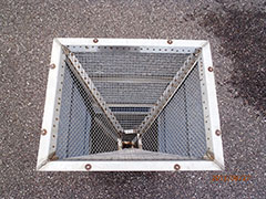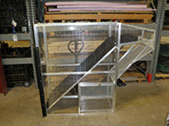 The key to the ELST is its unique ramp design that allows sea lamprey to pass, but not fin-fish. The ramp forms the entrance to the trap, and looks like a pegged slide enclosed in a cage. In contrast to traditional funnel traps, which are submerged in water, the ramp of the ELST protrudes partially out of the water on an angle, requiring fish to climb the ramp. A trickle of water from the top of the ramp wets the surface and entices fish to the ramp, but the water is not deep enough for fish to swim. Sea lamprey, which move using an eel-like (anguilliform) motion, use the pegs on the ramp to push upward, eventually slithering their way to the top and finally falling into a collection cage a few feet below the top of the ramp (Figures 3 and 4). Fin-fish, on the other hand, cannot propel themselves around the numerous, closely spaced pegs on the ramp, and are thereby blocked from climbing.