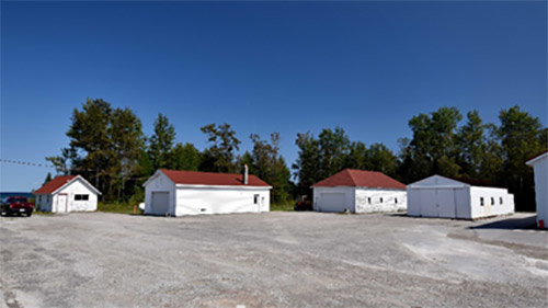 The old Hammond Bay Biological Station buildings, photographed in 2017. From left-to-right: limnology laboratory (constructed in the 1930s), workshop (constructed circa 1950), boathouse (constructed circa 1930), and metal storage building (assembled mid-1900s). Credit: USGS