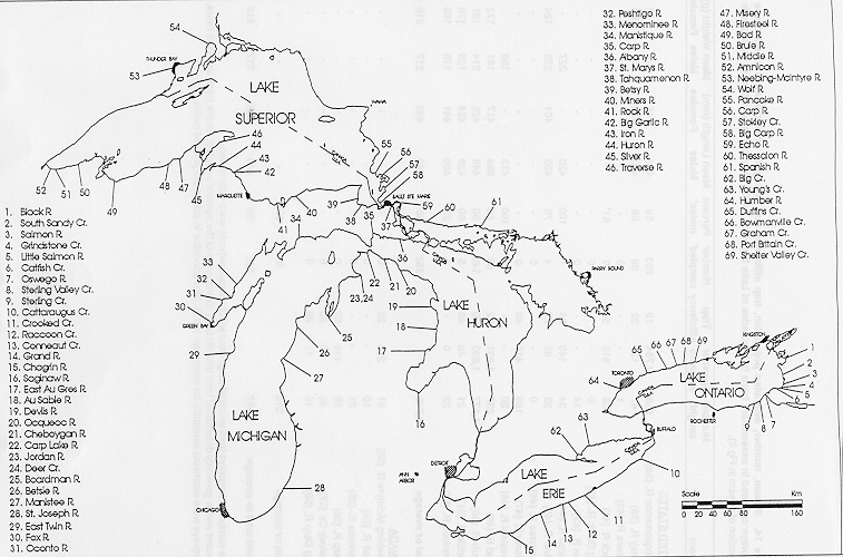 Table 14. Stream, number, estimated population, trap efficiency and biological characteristics of adult sea lampreys captured in assessment traps in tributaries of Lake Superior, 1995. (Number in parentheses corresponds to location of stream in Fig 8). Stream Number Spawner Trap Number Percent Mean Length (mm) Mean Weight (g) Caught estimate efficiency sampled (1) males (2) Males Females Males Females UNITED STATES Tahquamenon R. (38) 558 2,784 19 283 59 442 446 226 242 Betsy R. (39) 47 120 39 36 58 440 425 189 190 Miners R. (40) 1 - - 0 - - - - - Rock R. (41) 406 815 50 0 612 - - - - Big Garlic R. (42) 0 - - 0 - - - - - Iron R. (43) 14 - - 0 - - - - - Huron R. (44) 34 140 24 1 100 420 - 227 - Silver R. (45) 23 85 27 4 75 435 401 228 124 Traverse R. (46) 0 - - 0 - - - - - Misery R. (47) 189 413 46 0 - - - - - Firesteel R. (48) 20 - - 1 100 413 - 198 - Bad R. (49) 237 1,931 12 69 25 398 417 181 172 Brule R. (50) 1,177 1,693 70 149 56 446 425 214 191 Middle R. (51) 21 46 46 5 60 438 434 105 176 Amnicon R. (52) 22 0 - 4 25 400 441 176 165 Total or average 2,749 552 56 440 433 217 210 CANADA Neebing McIntyre R. (53)51 218 23 0 - - - - - - Wolf R. (54) 10 - - 0 60 (2) - - - - - Pancake R. (55) 31 - - 0 - - - - - - Carp R. (56) 62 119 52 0 - - - - - - Stokely Cr. (57) 49 78 63 0 - - - - - - Big Carp R. (58) 15 17 88 0 - - - - - - Total or average 218 0 60 - - - - - Grand total or average 2,967 552 56 440 433 2 17 210 1 The number of lampreys from which all length and weight measurements were determined. 2 Percent males generally determined from internal body examination of the number sampled. In the Rock and Wolf rivers, lampreys were examined externally for secondary sexual characteristics to determine percent males.