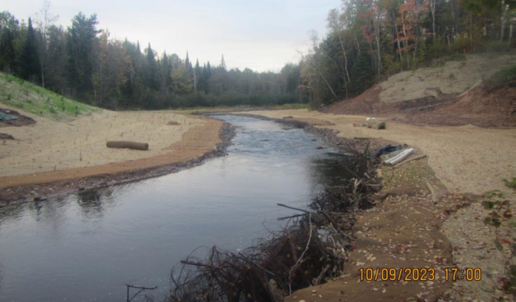 The engineering design for the stream restoration/culvert removal portion of the project was completed in 2021 with engineering design for the materials haul-out road ongoing. The design restored approximately 500 linear feet of stream channel and associated floodplain, removed an existing cast in-place a culvert, and removed approximately 29,000 cubic yards of soil, sloping the grade to 3:1 and 5:1, and disposing of the existing railroad embankment. In-stream habitat restoration features included installation of a j-hook, gravel riffles with boulders, toe wood and riffle habitat rocks, as well as reconnection to the floodplain at the embankment site. Construction began in August, 2023 and was completed in October, 2023 followed by post-restoration monitoring in 2023, 2024 and 2025. Project partners include the GLFC, NOAA, WDNR, WI DATCP, Douglas County, and the Town of Brule. The project was funded through federal (NOAA, USFWS), state (WI Trout Stamp Funds), and generous donations from local sportsmen and conservation groups.